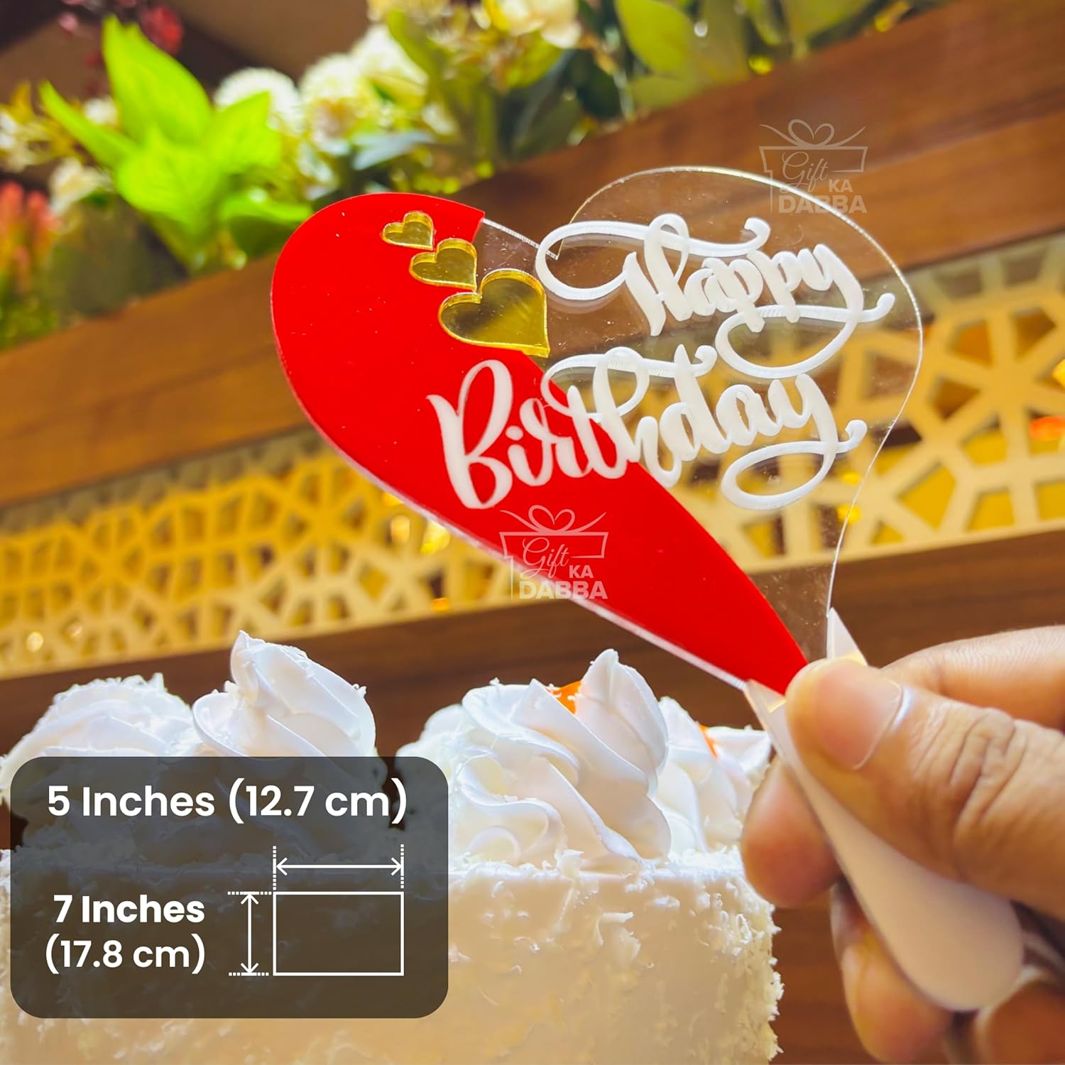 Make every birthday special with the Gift Ka Dabba Designer Acrylic Happy Birthday Cake Topper with Free Acrylic Knife. Designed with a modern layered heart style, this topper combines elegance and durability to enhance your cake decoration. Crafted with 2mm acrylic sheets, the topper features a transparent heart base, a glossy red half-heart, and three shiny golden hearts for a stunning 3D look. The white acrylic stick ensures stability when placed on cakes, making it easy to use and stylish. Unlike disposable paper toppers, this acrylic topper is washable, reusable, and long-lasting, making it a perfect keepsake for future celebrations. The set also includes a free acrylic cake cutting knife, ensuring your celebration is picture-perfect. Whether for kids, adults, or themed parties, this designer birthday cake topper adds a premium finishing touch to your celebrations.